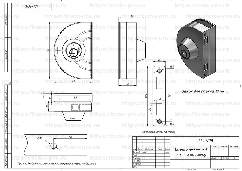 Замок стена-стекло для стеклянных дверей толщиной 10 мм. Особенности конструкции запорного механизма позволяют использовать на раздвижных дверях. Крепление замка возможно без сверления отверстий в стекле, но наилучший результат достигается при монтаже через отверстие. В комплекте-ответная часть на стену.